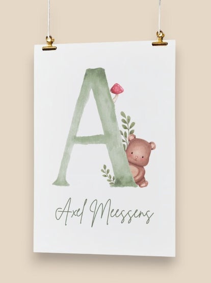 Maak de kinderkamer extra persoonlijk met deze lieve poster met de eerste letter van de naam van je kindje, omringd door schattige woodland diertjes.